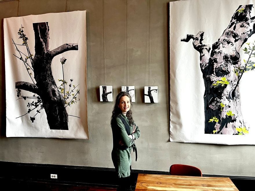It’s unsurprising that the painter drew her inspiration, in part, from Cole and his passionate promotion of the natural world. Several of the works are based on the powerfully emotive trees that frame some of Cole’s most famous paintings, among them 1836’s After the Storm — The Oxbow. “My crazy theory is that trees are the main character,” Betsy told me when we got together at Cafe Joust last Friday. “So I’m calling them out.”