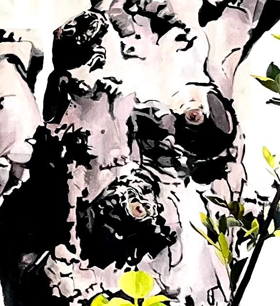For a minute I thought I was seeing things when I spotted an eye peering out from one of them. After all, trees, the older the better, are wonderfully expressive, doubling as Rorschach tests that invite the viewer to project his or her own imagination onto gnarled bark and twisted limbs. But I wasn’t imagining it. Betsy also pointed out breasts and nipples. She seems trees as metaphors for female aging and, I suspect, for her own next act.